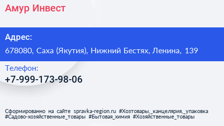 Амур-Инвест по адресу 678080, Саха (Якутия), Нижний Бестях, Ленина, 139 в дальнейшем Организация, размещена в следующих категориях: