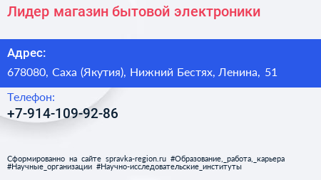 Лидер, магазин бытовой электроники по адресу 678080, Саха (Якутия), Нижний Бестях, Ленина, 51 в дальнейшем Организация, размещена в следующих категориях: