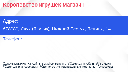 Королевство игрушек, магазин по адресу 678080, Саха (Якутия), Нижний Бестях, Ленина, 14 в дальнейшем Организация, размещена в следующих категориях: