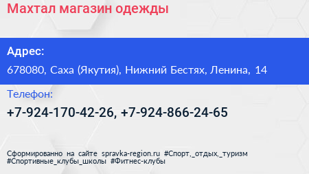 Махтал, магазин одежды по адресу 678080, Саха (Якутия), Нижний Бестях, Ленина, 14 в дальнейшем Организация, размещена в следующих категориях: