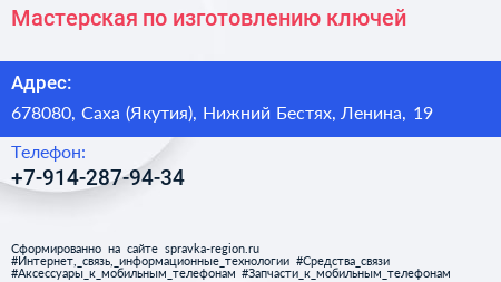 Мастерская по изготовлению ключей по адресу 678080, Саха (Якутия), Нижний Бестях, Ленина, 19 в дальнейшем Организация, размещена в следующих категориях: