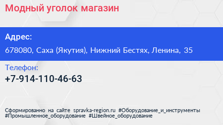 Модный уголок, магазин по адресу 678080, Саха (Якутия), Нижний Бестях, Ленина, 35 в дальнейшем Организация, размещена в следующих категориях: