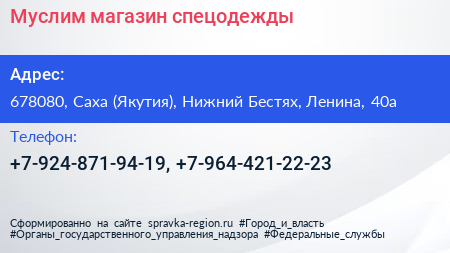 Муслим, магазин спецодежды по адресу 678080, Саха (Якутия), Нижний Бестях, Ленина, 40а в дальнейшем Организация, размещена в следующих категориях: