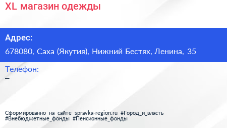 XL, магазин одежды по адресу 678080, Саха (Якутия), Нижний Бестях, Ленина, 35 в дальнейшем Организация, размещена в следующих категориях: