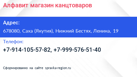 Алфавит, магазин канцтоваров по адресу 678080, Саха (Якутия), Нижний Бестях, Ленина, 19 в дальнейшем Организация, размещена в следующих категориях: