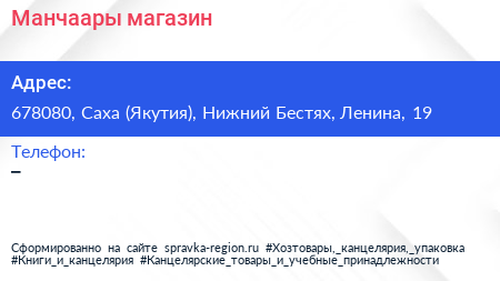 Манчаары, магазин по адресу 678080, Саха (Якутия), Нижний Бестях, Ленина, 19 в дальнейшем Организация, размещена в следующих категориях: