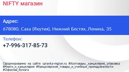 NIFTY, магазин по адресу 678080, Саха (Якутия), Нижний Бестях, Ленина, 35 в дальнейшем Организация, размещена в следующих категориях: