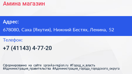 Амина, магазин по адресу 678080, Саха (Якутия), Нижний Бестях, Ленина, 52 в дальнейшем Организация, размещена в следующих категориях:
