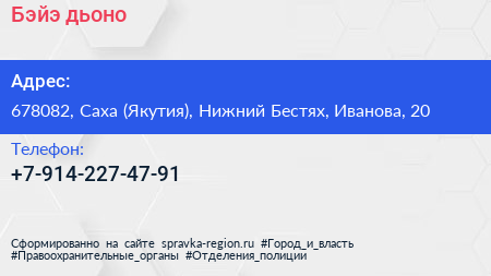 Бэйэ дьоно по адресу 678082, Саха (Якутия), Нижний Бестях, Иванова, 20 в дальнейшем Организация, размещена в следующих категориях: