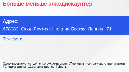 Больше меньше, алкодискаунтер по адресу 678080, Саха (Якутия), Нижний Бестях, Ленина, 71 в дальнейшем Организация, размещена в следующих категориях: