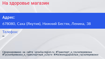 На здоровье, магазин по адресу 678080, Саха (Якутия), Нижний Бестях, Ленина, 38 в дальнейшем Организация, размещена в следующих категориях: