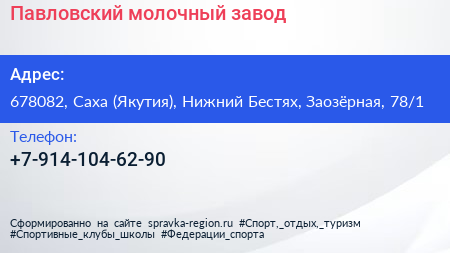 Павловский молочный завод по адресу 678082, Саха (Якутия), Нижний Бестях, Заозёрная, 78/1 в дальнейшем Организация, размещена в следующих категориях: