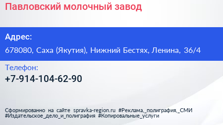 Павловский молочный завод по адресу 678080, Саха (Якутия), Нижний Бестях, Ленина, 36/4 в дальнейшем Организация, размещена в следующих категориях: