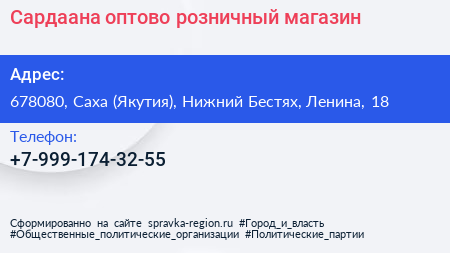 Сардаана, оптово-розничный магазин по адресу 678080, Саха (Якутия), Нижний Бестях, Ленина, 18 в дальнейшем Организация, размещена в следующих категориях:
