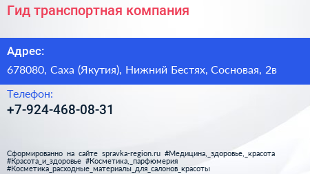 Гид, транспортная компания по адресу 678080, Саха (Якутия), Нижний Бестях, Сосновая, 2в в дальнейшем Организация, размещена в следующих категориях: