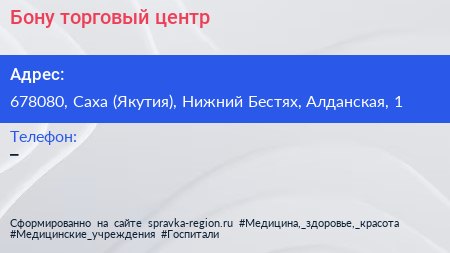 Бону, торговый центр по адресу 678080, Саха (Якутия), Нижний Бестях, Алданская, 1 в дальнейшем Организация, размещена в следующих категориях: