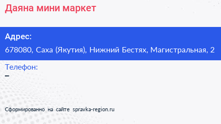 Даяна, мини-маркет по адресу 678080, Саха (Якутия), Нижний Бестях, Магистральная, 2 в дальнейшем Организация, размещена в следующих категориях: