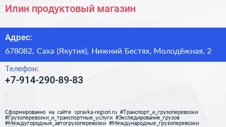 Илин, продуктовый магазин по адресу 678082, Саха (Якутия), Нижний Бестях, Молодёжная, 2 в дальнейшем Организация, размещена в следующих категориях:
