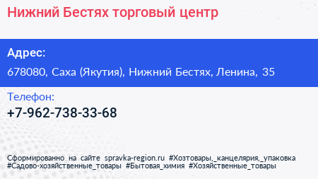 Нижний Бестях, торговый центр по адресу 678080, Саха (Якутия), Нижний Бестях, Ленина, 35 в дальнейшем Организация, размещена в следующих категориях: