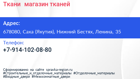Ткани+, магазин тканей по адресу 678080, Саха (Якутия), Нижний Бестях, Ленина, 35 в дальнейшем Организация, размещена в следующих категориях: