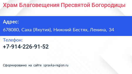 Храм Благовещения Пресвятой Богородицы по адресу 678080, Саха (Якутия), Нижний Бестях, Ленина, 34 в дальнейшем Организация, размещена в следующих категориях: