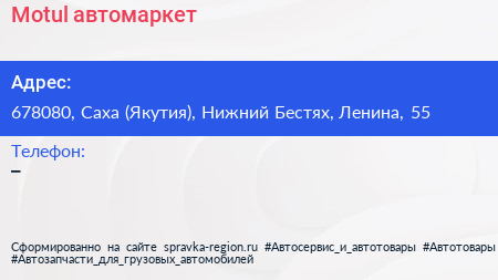Motul, автомаркет по адресу 678080, Саха (Якутия), Нижний Бестях, Ленина, 55 в дальнейшем Организация, размещена в следующих категориях: