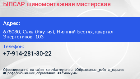 ЫПСАР, шиномонтажная мастерская по адресу 678080, Саха (Якутия), Нижний Бестях, квартал Энергетиков, 103 в дальнейшем Организация, размещена в следующих категориях: