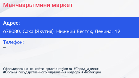 Манчаары, мини-маркет по адресу 678080, Саха (Якутия), Нижний Бестях, Ленина, 19 в дальнейшем Организация, размещена в следующих категориях: