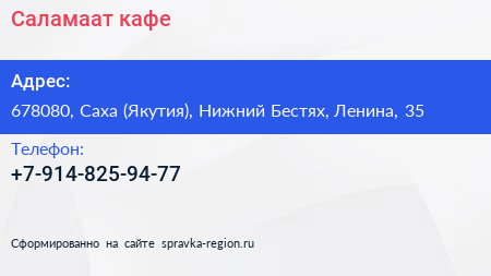 Саламаат, кафе по адресу 678080, Саха (Якутия), Нижний Бестях, Ленина, 35 в дальнейшем Организация, размещена в следующих категориях: