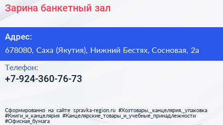 Зарина, банкетный зал по адресу 678080, Саха (Якутия), Нижний Бестях, Сосновая, 2а в дальнейшем Организация, размещена в следующих категориях:
