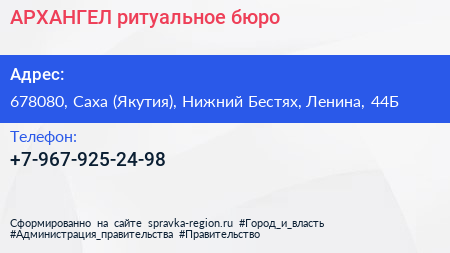 АРХАНГЕЛ, ритуальное бюро по адресу 678080, Саха (Якутия), Нижний Бестях, Ленина, 44Б в дальнейшем Организация, размещена в следующих категориях: