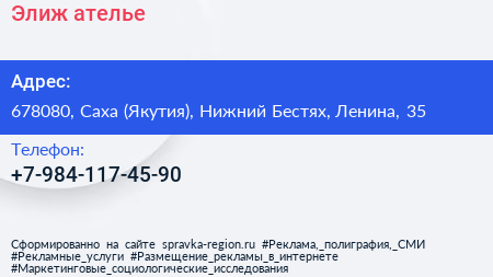 Элиж, ателье по адресу 678080, Саха (Якутия), Нижний Бестях, Ленина, 35 в дальнейшем Организация, размещена в следующих категориях: