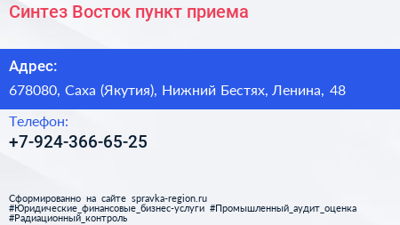 Синтез-Восток, пункт приема по адресу 678080, Саха (Якутия), Нижний Бестях, Ленина, 48 в дальнейшем Организация, размещена в следующих категориях: