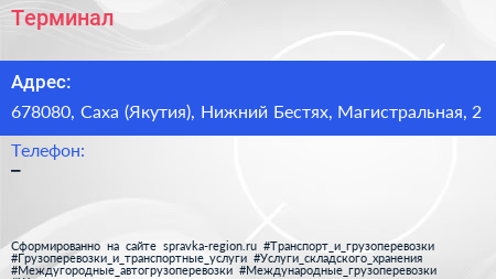 Терминал по адресу 678080, Саха (Якутия), Нижний Бестях, Магистральная, 2 в дальнейшем Организация, размещена в следующих категориях: