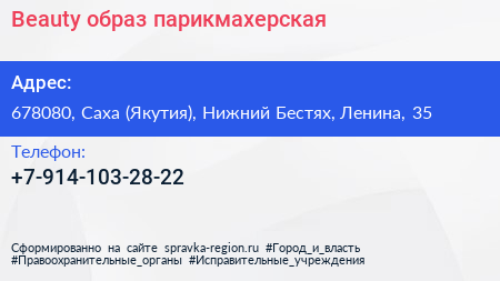 Beauty образ, парикмахерская по адресу 678080, Саха (Якутия), Нижний Бестях, Ленина, 35 в дальнейшем Организация, размещена в следующих категориях: