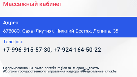 Массажный кабинет по адресу 678080, Саха (Якутия), Нижний Бестях, Ленина, 35 в дальнейшем Организация, размещена в следующих категориях: