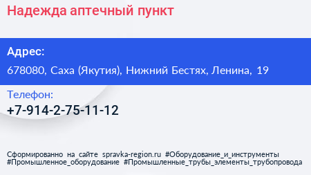 Надежда, аптечный пункт по адресу 678080, Саха (Якутия), Нижний Бестях, Ленина, 19 в дальнейшем Организация, размещена в следующих категориях: