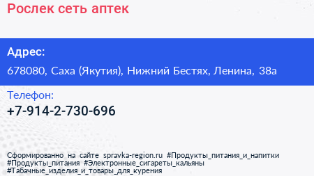 Рослек, сеть аптек по адресу 678080, Саха (Якутия), Нижний Бестях, Ленина, 38а в дальнейшем Организация, размещена в следующих категориях: