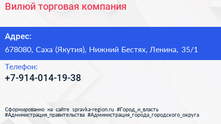 Вилюй, торговая компания по адресу 678080, Саха (Якутия), Нижний Бестях, Ленина, 35/1 в дальнейшем Организация, размещена в следующих категориях: