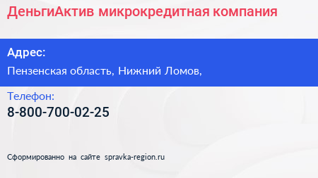 ДеньгиАктив, микрокредитная компания по адресу Пензенская область, Нижний Ломов, в дальнейшем Организация, размещена в следующих категориях: