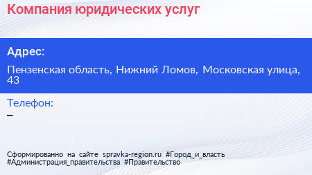 Компания юридических услуг по адресу Пензенская область, Нижний Ломов, Московская улица, 43 в дальнейшем Организация, размещена в следующих категориях: