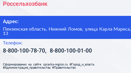 Россельхозбанк по адресу Пензенская область, Нижний Ломов, улица Карла Маркса, 13 в дальнейшем Организация, размещена в следующих категориях: