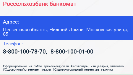 Россельхозбанк, банкомат по адресу Пензенская область, Нижний Ломов, Московская улица, 85 в дальнейшем Организация, размещена в следующих категориях:
