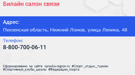 Билайн, салон связи по адресу Пензенская область, Нижний Ломов, улица Ленина, 48 в дальнейшем Организация, размещена в следующих категориях: