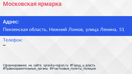 Московская ярмарка по адресу Пензенская область, Нижний Ломов, улица Ленина, 51 в дальнейшем Организация, размещена в следующих категориях: