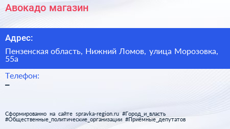 Авокадо, магазин по адресу Пензенская область, Нижний Ломов, улица Морозовка, 55а в дальнейшем Организация, размещена в следующих категориях: