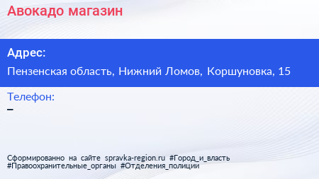 Авокадо, магазин по адресу Пензенская область, Нижний Ломов, Коршуновка, 15 в дальнейшем Организация, размещена в следующих категориях: