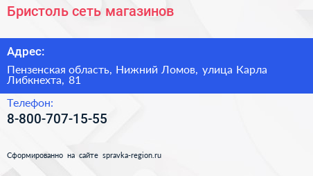 Бристоль, сеть магазинов по адресу Пензенская область, Нижний Ломов, улица Карла Либкнехта, 81 в дальнейшем Организация, размещена в следующих категориях: