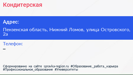 Кондитерская по адресу Пензенская область, Нижний Ломов, улица Островского, 2а в дальнейшем Организация, размещена в следующих категориях: