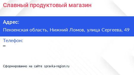 Славный, продуктовый магазин по адресу Пензенская область, Нижний Ломов, улица Сергеева, 49 в дальнейшем Организация, размещена в следующих категориях: